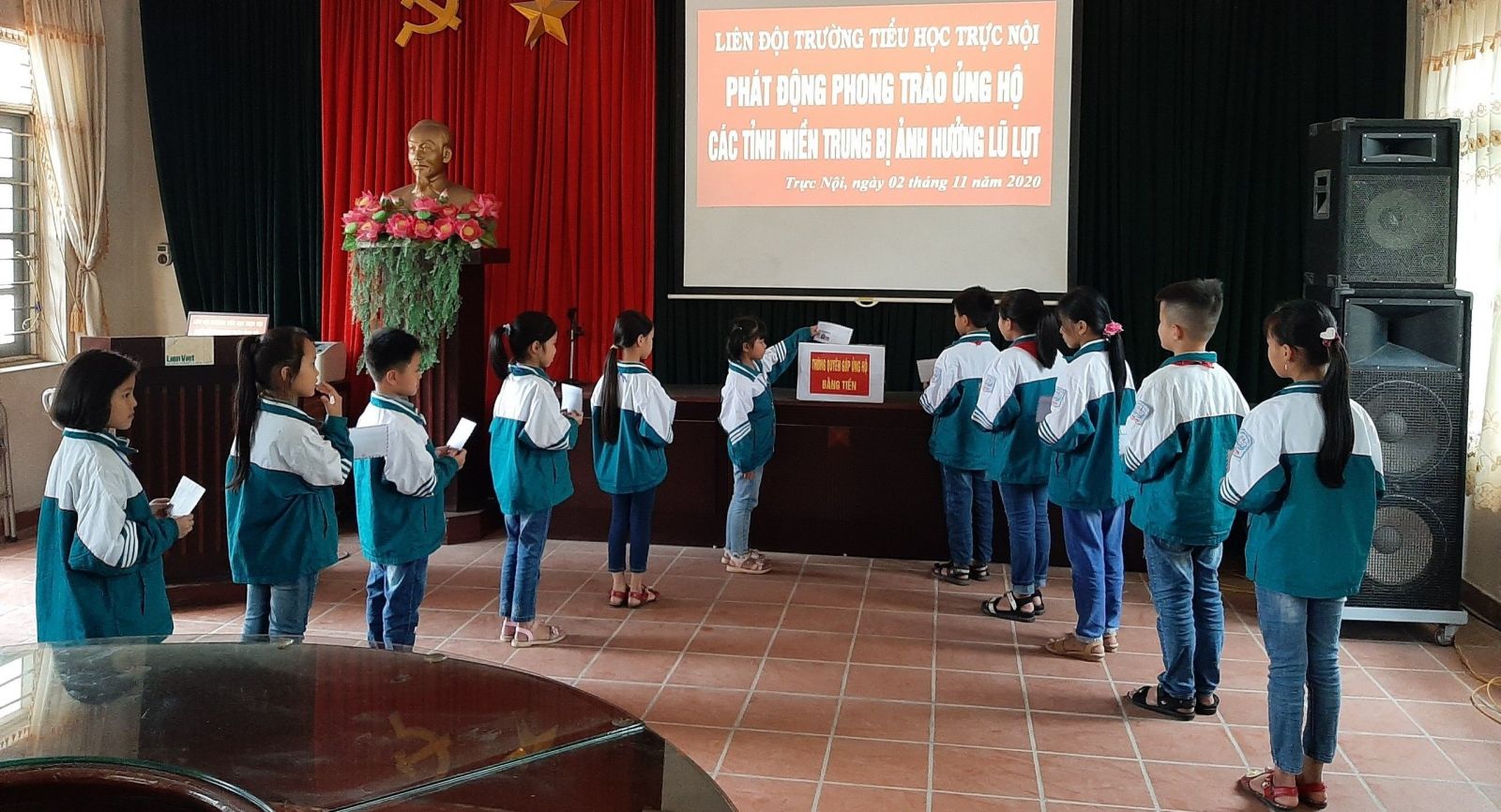Sau đây là một số hình ảnh của các em học sinh các khối lớp ủng hộ các tỉnh miền Trung bị ảnh hưởng lũ lụt.